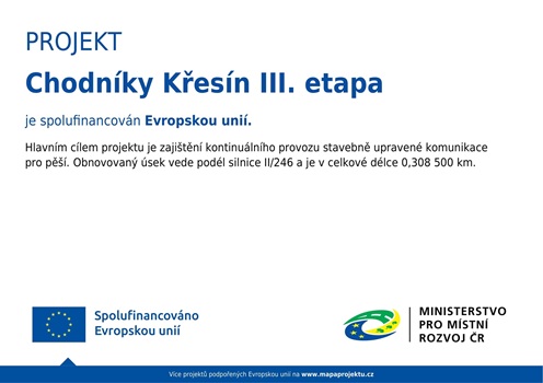 Realizací projektu došlo k rekonstrukci zpevněných ploch pro chodce v délce 454,72 m. Jednalo se o 5 úseků chodníkových ploch. Většina úseků se nachází ve středu obce a navazuje na stávající chodníkové plochy. Samotná fyzická realizace projektu byla provedena v termínu 27.10. 2020 až 23.06. 2021. Chodníkové plochy jsou řešeny bezbariérově. Cíl zvýšení bezpečnosti chodců v obci Křesín byl naplněn. Projekt „Oprava chodníků v k.ú. Křesín“ je spolufinancován Evropskou unií.